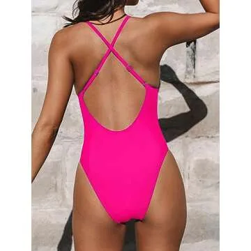 CUPSHE Women Swimsuit One Piece Bathing Suit Deep V Neck Crisscross Back Adjustable Strap, L Hot Pink