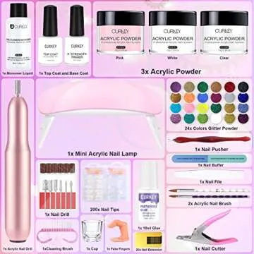 Show more If you're looking to embrace your creativity and elevate your nail game, the Curkey Acrylic Nail Kit for Beginners is the perfect choice! This comprehensive 65 in 1 professional acrylic nail kit offers everything you need to craft stunning nail designs right in the comfort of your home. With 24 vibrant colors of acrylic powder, a powerful acrylic nail drill, and an array of essential manicure tools, you're equipped to explore a whole new world of nail artistry.