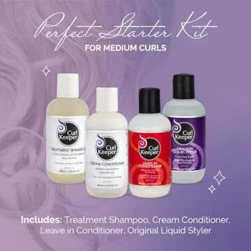 Show more Your curls deserve to shine, and with the Medium Curl Kit from Curl Keeper, they certainly will! This all-inclusive kit is tailored for fine to thick textures that crave precisely the right blend of moisture, strength, and styling support. Featuring a travel-sized regimen, including a 3.4 oz Treatment Shampoo, Cream Conditioner, Leave-in Conditioner, and Original Liquid Styler, it is your key to transforming frizzy, undefined curls into stunning and well-defined locks.