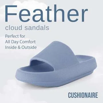 Show more Experience the ultimate in relaxation with the CUSHIONAIRE Feather Slides. These innovative slippers blend an elegant design with superior comfort, making them the perfect choice for women who appreciate both style and functionality. Crafted from high-quality EVA foam, these slides feature a cloud-like cushioning that cradles your feet, providing soft support whether you are lounging at home or stepping out for quick errands. The airy, lightweight construction ensures that your feet never feel weighed down, allowing for all-day wear.