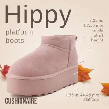 Show more Step into the cozy comfort of winter with the CUSHIONAIRE Hippy Women’s Platform Ankle Boots. Crafted with a luxurious genuine suede upper, these boots shine with a sleek appearance while providing the durability needed for everyday wear. Whether you're heading out for errands or enjoying a casual outing, these ankle boots are your go-to footwear for cold weather.