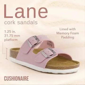 Show moreDiscover the ultimate fusion of style and comfort with the CUSHIONAIRE Lane Cork Footbed Sandals for Women. These exceptional sandals redefine casual footwear with their thoughtfully designed features tailored to meet the needs of busy women on the go. Crafted from premium faux leather, they sport an adjustable double buckle design, allowing you to customize your fit for unparalleled comfort. With a genuine suede footbed that contours beautifully to your foot, these sandals are the ideal companion for all-day wear, whether you're out for a casual stroll or tackling busy errands.