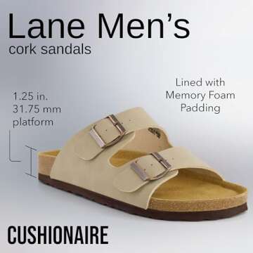 Show moreStep into comfort and style with the CUSHIONAIRE Men's Lane Cork Footbed Sandal, featuring adjustable buckle straps and made from premium materials. Crafted from 100% genuine suede insoles, these sandals provide a custom fit as they mold to the contours of your feet over time. The stone nubuck finish not only enhances its aesthetic appeal but also ensures durability, making it a perfect choice for both relaxed outings and casual events. Every step is cushioned with a flexible cork footbed that delivers exceptional comfort, ensuring that your feet are pampered throughout the day.