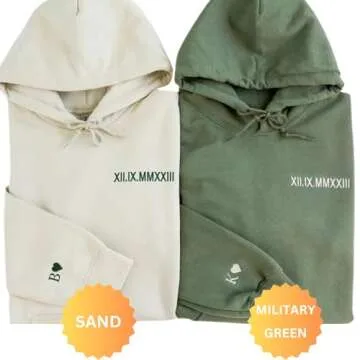 Show moreElevate your gifting game with our exquisitely crafted Custom Embroidered Roman Numeral Sweatshirts. Made from a premium blend of 50% cotton and 50% polyester, these sweatshirts are not only delightfully soft and warm but also built to last. Designed with pre-shrunk fleece knit to minimize pilling and ensure durability, they also feature spandex cuffs and waistbands that provide a comfortable fit. Perfect for couples, they've quickly become the must-have wardrobe staple for any season.