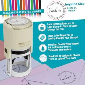 Available in an array of 15 vibrant ink colors, the customization possibilities are endless. Whether you prefer a classic black or a bold blue, your stamped impressions will always have a professional touch. Designed with a secure locking bottom cover, this stamp ensures the ink pad remains fresh and ready for use, preserving the quality of your impressions over time. Perfect for use on envelopes, cards, or any paper project, this stamp combines style with functionality.