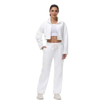 Cute 2 Piece Sets Outfits for Women Wide Leg Cargo Sweat Pants Long Sleeve Cropped Sweatshirt Matching Sweatsuit Tracksuit Lounge two Gym Workout Athletic Golf Business Casual Trendy Clothes White M