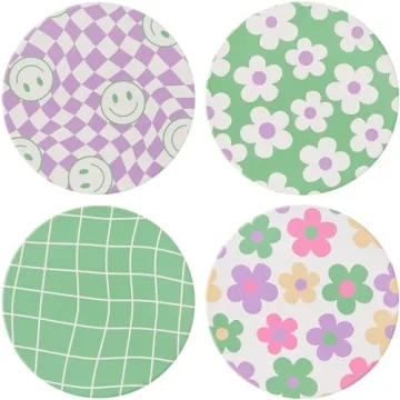 Show more Introducing the Cute Aesthetic Drink Coasters Set, a delightful collection of four vibrant coasters that blend function with fun. Each coaster showcases a unique funky pattern that breathes life into your decor, making them not only practical pieces for your home but also trendy accents that reflect your modern style. Crafted with quality ceramic, these coasters effectively absorb moisture, protecting your surfaces while adding a pop of color to your coffee table or college desk. Perfect for anyone looking to enhance their living space, these charming coasters are a must-have!