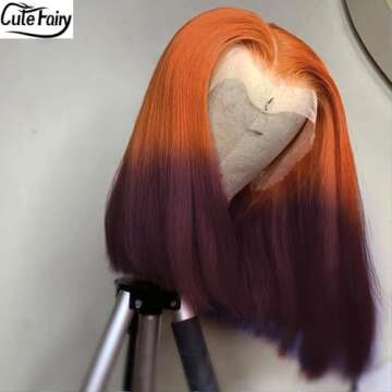 Show more Introducing the Cute Fairy Ombre Ginger Orange Bob 13x4 Lace Front Wig, a stylish and fun addition to your hair collection! Measuring 12 inches and featuring a vibrant two-tone design with ginger and purple highlights, this wig is perfect for those looking to make a statement. Made from 100% unprocessed Brazilian 12A virgin human hair, it offers luxurious softness and a natural feel. The pre-plucked hairline with bleached knots ensures a seamless, realistic look that blends beautifully with your own hairline. Its lightweight and breathable construction offers comfort throughout wear, making it ideal for daily use or special occasions.