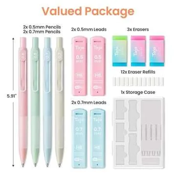 Show more Introducing our delightful mechanical pencil set, the perfect blend of style and functionality. This All-In-One Set features a total of seven pieces including 2pcs of 0.5mm and 2pcs of 0.7mm mechanical pencils. To keep your creativity flowing, we've included 4 tubes of high-quality lead refills (2 tubes each for both sizes), 3 versatile erasers, and a box of cap eraser refills, all neatly organized in a charming case. You can trust that every detail has been crafted with care, ensuring maximum usability over time.
