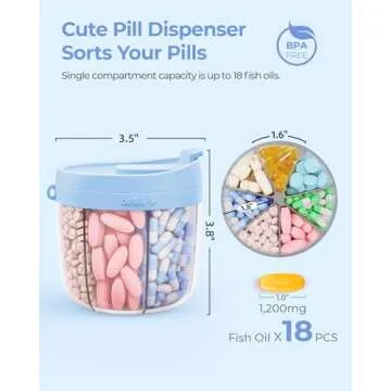 Show moreIntroducing the Cute Pill Dispenser with 7 Large Compartments—your ultimate companion for keeping your daily supplements organized and easily accessible! This portable pill bottle organizer features a clever design, equipped with seven spacious compartments specifically designed to hold an array of supplements including vitamins, fish oil capsules, and calcium tablets. Measuring at a compact 3.8" in height and with a top lid diameter of 3.5", it weighs only 5.4 ounces, making it effortlessly portable without sacrificing storage capacity.