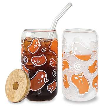 Show more Introducing the perfect blend of charm and functionality with our **Cute Spooky Halloween Ghosts Can Glass**! This whimsical 16-ounce borosilicate glass cup is an essential for coffee enthusiasts and those who revel in the delightful spirit of Halloween. The cup features a stunning design adorned with adorable Halloween ghosts that magically change color with the temperature of your beverage. Crafted from 100% borosilicate glass, it ensures unparalleled durability and resistance to thermal shock, making it your reliable companion for all occasions.