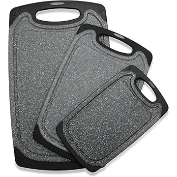 that allows for versatile usage, you can chop on one side and utilize the flat surface on the opposite side for larger cutting tasks. The set includes a large board (15.6x9.4 inches) perfect for steaks, a medium board (12.4x7.8 inches) for vegetables, and a small board (9.6x5.7 inches) for fruits, ensuring you have the right tool for every preparation.