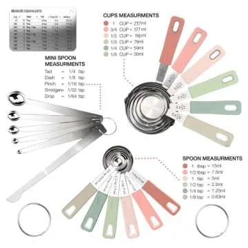 Show more Introducing the ultimate measuring set destined to revolutionize your cooking and baking experience! This thoughtfully crafted 22-piece set by CuttleLab is an essential companion in every kitchen, ensuring you never have to guess a measurement again. Featuring an array of 6 measuring cups ranging from 1/8 cup to 1 cup and 6 measuring spoons from 1/8 tsp to 1 tbsp, you’ll find the perfect tool for any recipe. Additionally, the set includes 5 mini-measuring spoons for those precise tiny amounts – drop, smidgen, pinch, dash, and tad. To keep your culinary life organized, we've included a handy cup- or spoon-leveling tool with a mini ruler and a fridge-magnet conversion chart to make quick conversions a breeze.
