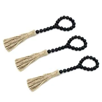 Show more Elevate your home decor with the CVHOMEDECO Wood Beads Garland with Tassels. This exquisite set includes three beautifully crafted garlands, each measuring 12 inches in total length, adorned with stunning black wooden beads that are 5/8" in diameter. The garlands feature a delightful 2-1/2" diameter loop, perfect for versatile hanging solutions. Crafted from natural wood and jute, these garlands effortlessly blend rustic charm with modern aesthetics, making them perfect for any space in your home.