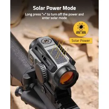 Show more The CVLIFE Solar Red Dot Sight is the ultimate tool for precision shooting that combines cutting-edge technology with practical functionality. Powered by both solar energy and a battery, this sight ensures you have reliable performance regardless of lighting conditions. The ability to switch between solar mode and battery power means you're never left in the dark. The sight automatically adjusts reticle intensity, making it easier to aim accurately whether you're in bright sunlight or low-light situations.