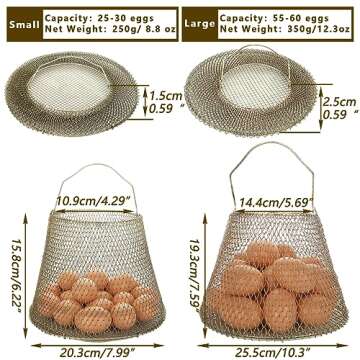 Show moreIntroduce yourself to the CYEAH Egg Basket Set of 2, a specially crafted solution for egg gathering and storage that embodies both functionality and rustic charm. Made from sturdy metal, these egg baskets are designed to withstand the rigors of farm life while adding a touch of elegance to any kitchen decor. Each set includes two baskets of varying sizes—one measuring 10" in diameter and 7.5" high, and the other at 8" diameter and 6" high—making them perfect for gathering fresh eggs while ensuring a delightful farmhouse aesthetic. The light golden appearance adds a vintage vibe, making these baskets not just tools, but beautiful accents in your home.