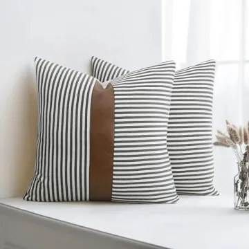 Show more Transform your living space into a cozy sanctuary with our exquisite FARMHOUSE PILLOW COVERS. This delightful set includes two pieces of faux leather stripe pillow covers that immediately add a touch of charm to any room. Featuring a cream base stripe with faux leather accents, these covers are designed thoughtfully to enhance your decor. The classic striped pattern, available in a blend of neutral cream tones with stylish black, navy blue, or grey, makes these covers effortlessly versatile.