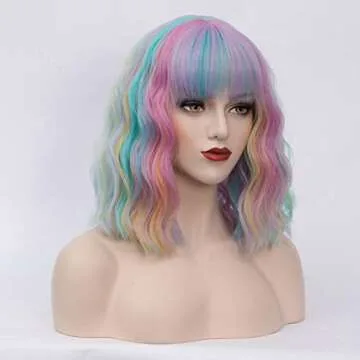 Cying Lin Short Bob Wavy Curly Wig Rainbow Air Bangs Wig For Women Cosplay Halloween Wigs Heat Resistant Bob Party Wig (Rainbow)