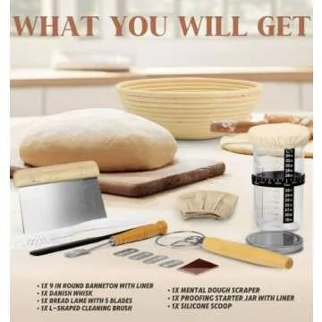 Show more Discover the art of baking with our exceptional sourdough starter kit, designed for both beginners and seasoned bakers. This comprehensive set includes everything you need to embark on your bread-making journey. With a Danish Whisk perfect for blending flour and eggs, a Linen Liner that prevents dough from sticking, and a Dough Scraper for efficient handling of your dough, you'll find every tool necessary for success. Our kit also features an L-shaped Cleaning Brush that ensures your bread proofing basket is spotless and ready for the next use.