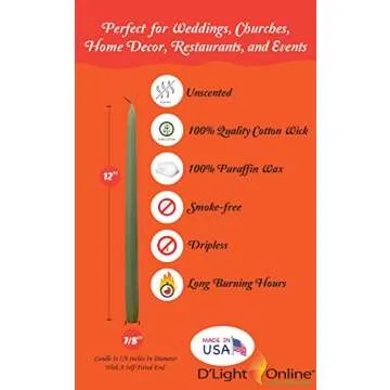 Show moreTransform any setting into a magical experience with the D'light Online Elegant 12" Olive Green Taper Candles. Crafted to perfection, these premium-quality candles feature a stunning basil green hue that adds sophistication and charm to your decor. Hand-dipped and thoughtfully designed, they provide an effortless way to create a warm and inviting atmosphere for any occasion.