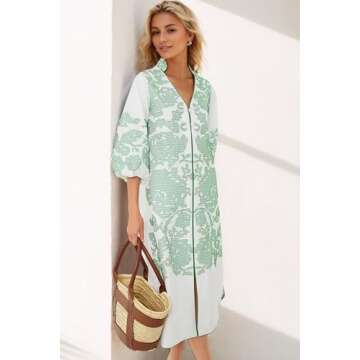 D-Sun Women Casual V-Neck Mid Dress Floral Embroidery 3/4 Sleeves Fall Winter Tunic Dress Loose Zip Party Dress with Pockets Green