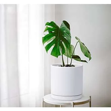 D'vine Dev 10 Inch Ceramic Planter Pot with Drainage Hole and Saucer, Indoor Cylinder Round Planter Pot, White, 94-O-E-1