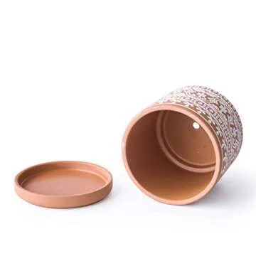 Show more Elevate your indoor gardening experience with the D'vine Dev Set of 2 Terracotta Pots. Designed with a beautiful wave pattern, these handcrafted terracotta planters seamlessly combine functionality and elegance, making them perfect homes for your favorite indoor plants or vibrant succulents. Crafted from durable clay, each pot features a charming terracotta and white finish that not only adds a touch of sophistication to your home but also ensures optimal growth for your plants. Available in two sizes, 4 inches and 6 inches, these pots are versatile companions for any plant enthusiast, bringing joy and greenery to various spaces.