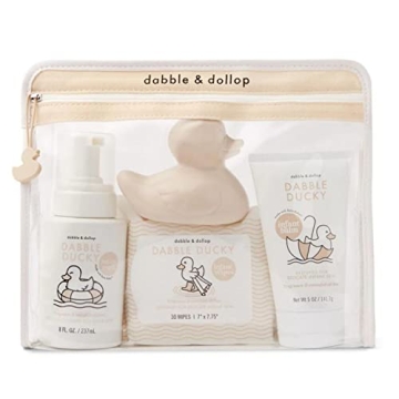 Show more The Dabble & Dollop Infant Essentials Kit brings you an all-inclusive solution to caring for your baby’s delicate skin. Packaged in a stunning, reusable tote decorated with the charming Dabble Ducky, this gift set is not just functional; it’s a delightful addition to any nursery. Each full-size product is carefully crafted in the USA, ensuring they meet the highest standards of quality and safety for your little one.