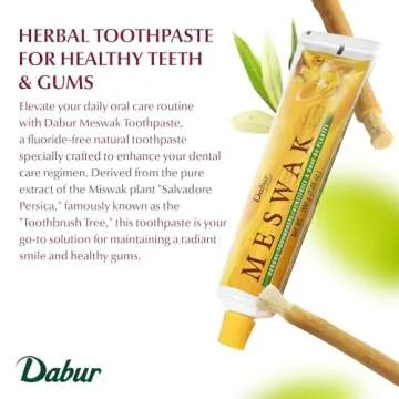 Show more UNLOCK THE POWER OF MESWAK with Dabur's Herbal Toothpaste, a unique formula harnessing the rare and potent Miswak herb, sourced from the rugged terrains of Africa and South Asia. This time-tested wonder herb has been carefully curated to elevate your oral health routine. Not only does it provide a robust defense for your dental hygiene, but it also revitalizes your mouth with every brush. Experience the incredible astringent effect of Miswak, designed specifically to strengthen gums and reduce bad breath. This remarkable ingredient contains tannins that work tirelessly to inhibit glucosyltransferase, a key contributor to plaque buildup, thereby bolstering overall gum health.