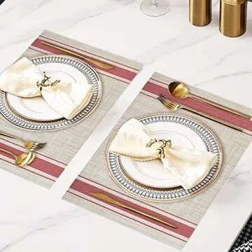 DACHUI Placemats Set of 6, Soft & Elegant Woven Vinyl Place Mats, Water Resistant, Heat Resistant, Washable, Durable Table Mats (Red Stripes)