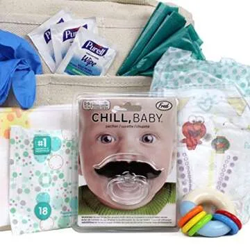 The kit includes 11 essential items: a canvas tool bag, baby wipes, tongs, disposable changing pads, disposable diapers (size 1), hand sanitizing wipes, disposable diaper bags, disposable gloves, goggles, a wooden rattle, and a mustache pacifier.
