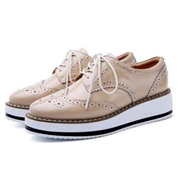 Show moreStep into the world of chic sophistication with the DADAWEN Women's Platform Lace-Up Wingtips Oxfords. Crafted to blend comfort with style, these unique shoes sit at the intersection of classic design and modern flair. With a striking apricot hue that brightens up your wardrobe, these oxfords boast a retro British brogue design for that perfect touch of elegance. Made from water-resistant and durable leather, they assure quality and reliability while you're on the go. Designed to provide an ideal fit, these shoes come with an adjustable lace-up closure that ensures your feet stay secure and comfortable throughout the day.