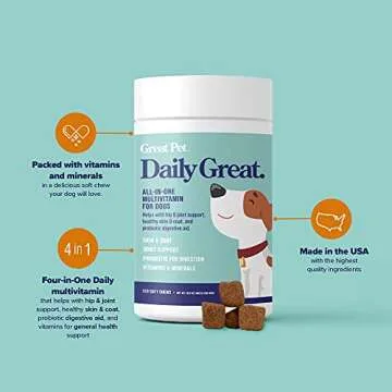 Daily Great Multivitamins for Dogs - Dog Vitamins & Supplements, Glucoasmine, Chondrotin, Omega 3 & Probiotics for Healthy Hip & Joint, Skin & Coat, Heart & Digestion - 120 Natural Multi Vitamin Chews