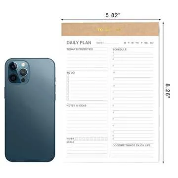 Show more Introducing the Daily To Do List Notepad by Oneirom, your ultimate companion for productivity and organization. Designed with practicality in mind, this compact memo planning pad features 52 undated tear-off sheets, allowing you to start fresh with every new task or goal. With dimensions of 5.8" × 8.2", it’s perfectly sized to fit into your life seamlessly—whether in your backpack, purse, or on your kitchen counter. Enjoy the freedom of carrying your plans anywhere and everywhere while maintaining a clutter-free approach to daily tasks and reminders.