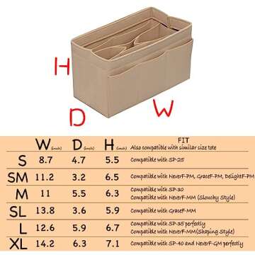 The DailyPlus Purse Organizer comes in several versatile sizes: S, SM, M, SL, L, and XL to fit various handbag styles.