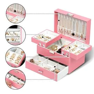 Dajasan Jewelry Box for Girls Women, PU Leather Jewelry Organizer Box, 3 Layers Jewelry Gift Box for Christmas, Valentine's Day, Birthday, Mother's Day (Pink)