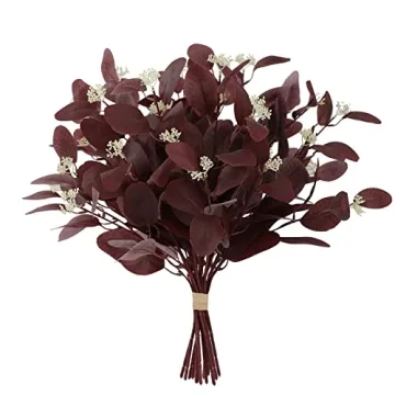 The striking burgundy artificial eucalyptus stems provide a versatile addition to your decor, perfectly suited for a wide range of settings. Whether you are sprucing up your home, farmhouse, kitchen, office, or bedroom, these faux stems integrate seamlessly into any aesthetic. Use them to create breathtaking table centerpieces, elevate bouquets for special occasions or weddings, or simply beautify your outdoor patio with their charming and vibrant presence.