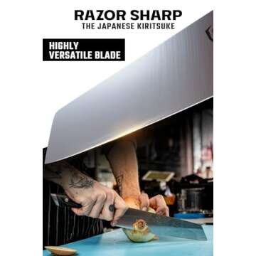 Show moreExperience the unparalleled excellence of the Dalstrong Kiritsuke Chef Knife - 8.5 inch, celebrated for its incredible craftsmanship, cutting-edge technology, and stunning design elements. Crafted from imported high-carbon German steel, this full-tang kitchen knife is a true embodiment of peak performance and aesthetics, making it a must-have for both professional chefs and cooking enthusiasts alike. With a hand-polished edge at an impressive 16-18 degrees per side, and engineered to perfection with a Rockwell hardness of 56+, this knife promises exceptional sharpness and durability, ensuring every slice you make is precise and effortless.