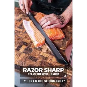 Show moreIntroducing the Dalstrong Tuna Knife from the Shadow Black Series – an unparalleled tool for culinary masters and seafood enthusiasts alike. This stunning 17-inch slicer is inspired by the traditional maguro kiri bōchō, a centerpiece of Japanese cutlery artistry. A fusion of ancient tradition and modern utility, this knife features high-carbon 7CR17MOV-X super-steel, boasting an impressive hardness rating of over 58 HRC. This impressive strength ensures that you can effortlessly tackle even the largest tuna or other fish. Each blade is crafted with precision, employing a hand-sharpened single bevel that maintains a razor-sharp 16-18° angle, allowing for ultra-thin slices with minimal effort.