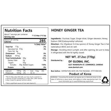 Show more Introducing the Damtuh Honey Ginger Tea, a delightful fusion of natural ingredients and bold flavors, perfect for tea enthusiasts and anyone looking to enhance their daily routine with a warm and comforting beverage. Made with real, authentic ginger slices, this ginger tea offers a robust, zesty flavor profile that's both invigorating and soothing. Each 1.7lb (770g) jar is crafted without any artificial ingredients, ensuring that you get only the purest ginger experience in every cup. Its versatility allows you to enjoy it hot or iced, making it a must-have for all seasons.