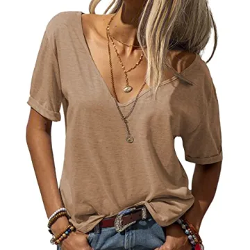 Show moreIntroducing the Danedvi Women Fashion Deep V-Neck Top - your go-to wardrobe staple for effortless style and comfort! Made from a premium blend of 65% Rayon, 30% Polyester, and 5% Spandex, this lightweight fabric is incredibly soft and breathable, making it perfect for daily wear. The loose fitting design features a captivating deep V-neckline and short sleeves, allowing for a relaxed yet chic look that is versatile for any occasion. From casual outings to social gatherings, this basic tee remains timeless and is available in beautiful colors, including trendy khaki. Whether you style it with skinny jeans, shorts, or skirts, it's sure to become a favorite in your closet.