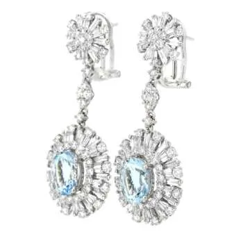 Dangling Earrings, Aquamarine 3.07 Carat Adjacent Natural Baguette and Round Brilliant Diamonds 4.03 Carat. Set in 18K White Gold.