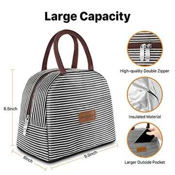 DANIA & DEAN Durable Insulated Lunch Bag for Women/Kids Double Zippers Wide Open Tote Bag Leakproof Thermal and Cooler Reusable Lunch Box for Office/School/Outdoor (Black and White Stripes)