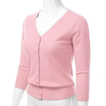 danibe Women's 3/4 Sleeve V-Neck Button Down Knit Sweater Soft Cardigan Pink L