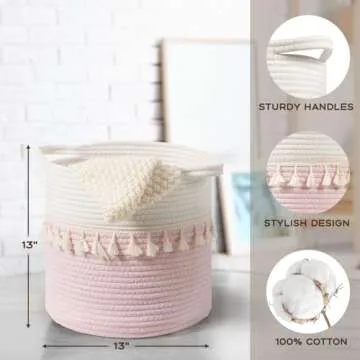 danpinera 3-Pack Round Baskets for Organizing, 11 Inch Boho Woven Baskets for Storage with Handle and Tassel for Decor, Practical Storage Basket for Shelves, Easy to Grip, Pink