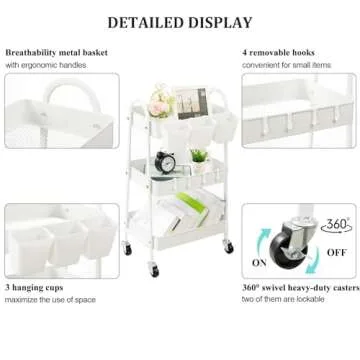 danpinera 3-Tier Rolling Cart, Metal Rolling Storage Cart with Lockable Wheels & Hanging Cups & Hooks, Mobile Trolley Cart for Kitchen, Bathroom, Office, Workshop, White