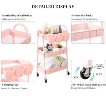 Danpinera 3-Tier Rolling Cart - Chic Pink Mobile Trolley with Hooks