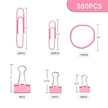 Show more Introducing the ultimate office companion designed to brighten your workspace and enhance your productivity! This meticulously curated set includes 43 binder clips in three practical sizes (15mm, 19mm, and 25mm) and 260 paper clips in two sizes (33mm and 50mm), along with 77 general-purpose rubber bands. A total of 380 quality items ensure that you are well-equipped to handle various tasks, whether in the office, at home, or at school.