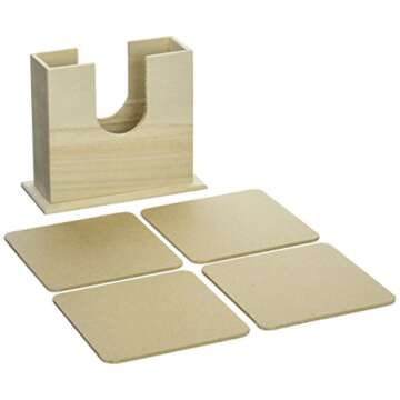 Show moreDiscover the joy of creativity with our exquisite DIY Wooden Coaster Set. This unique set allows you to embellish and decorate coasters that perfectly match any decor, making it an essential addition to your home or as a thoughtful gift for loved ones. The kit includes a sturdy wood holder and four square wood coasters, providing the perfect canvas for your artistic flair. Whether you're a seasoned DIY enthusiast or a complete novice, these coasters are easy to customize, making them a delightful project for all ages.