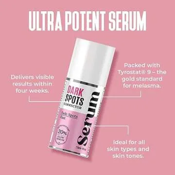 Show more If you're on the journey to reclaiming your skin's radiance, look no further than this exceptional Dark Spot Serum. Known as Amazon's ultimate solution for dark spots, this fast-absorbing serum is expertly formulated with powerful brightening agents, AHA, and peptides designed to fade dark spots and melasma effectively. Its key ingredients, including patented natural plant extracts like Tyrostat HR and 5-Melanostatine, have been clinically proven to deliver remarkable results within just four weeks.